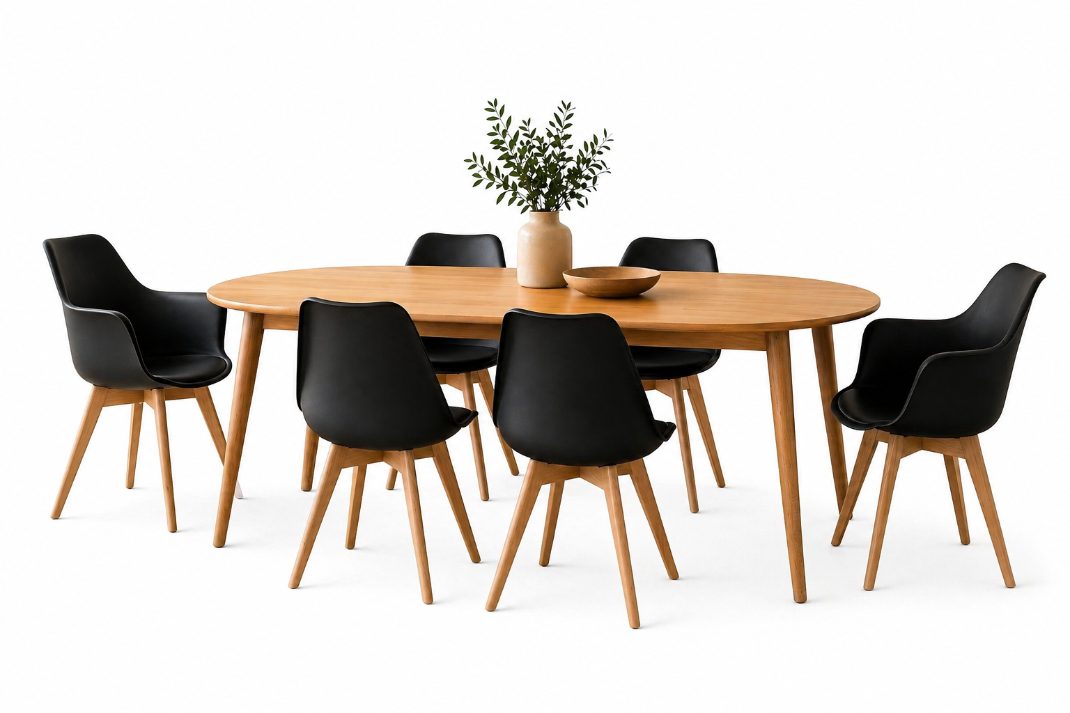 Comedor de estilo nórdico con mesa de madera natural y sillas negras de diseño moderno.